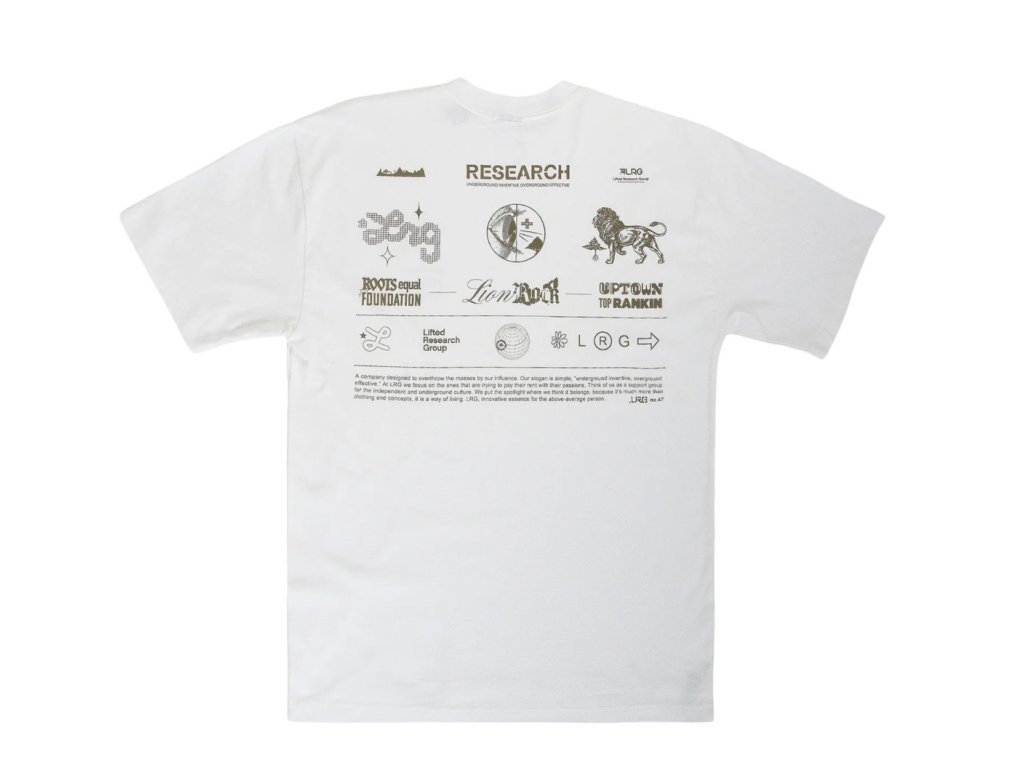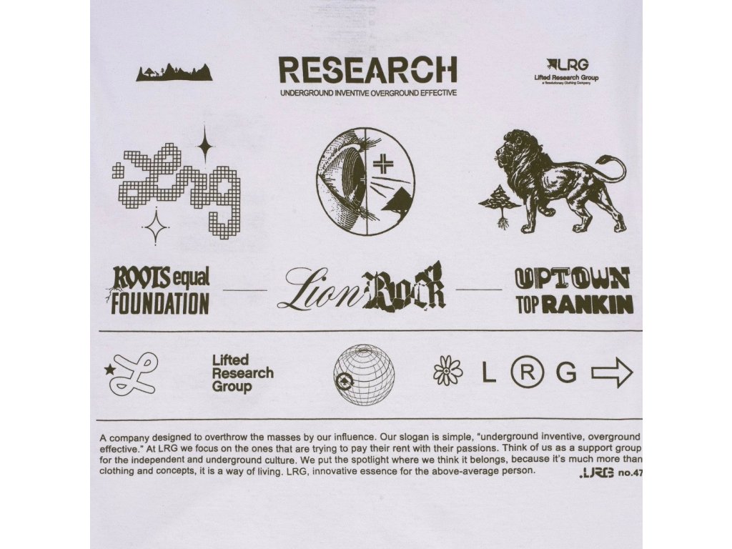 LRG ( Lifted Research Group), je brand ktorý bol založený v roku 1999 v Californii so zameraním na pouličnú kultúru. Zakladateľmi sú Jonas Bevacqua a Robert Wright. LRG podporuje undergroundovu kultúru a umelcov z celého sveta. Legenda je späť !